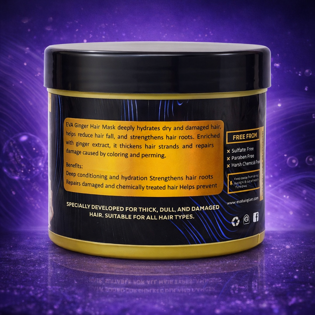Eva Ginger Oil Hair Mask is an intensive protein & keratin treatment designed to strengthen weak hair, reduce hair fall, and restore natural shine. Enriched with 100% organic ginger oil, this sulfate-free formula deeply nourishes the hair shaft, improves elasticity, and leaves hair soft, silky, and manageable.